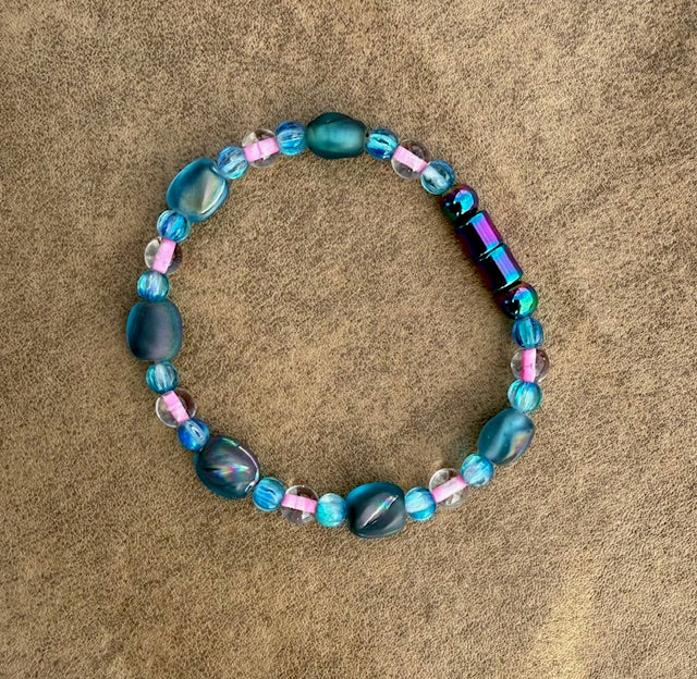 Dyed/plated glass beads in shades of teal with a pink lined accent bead. Beads may vary in color from picture.